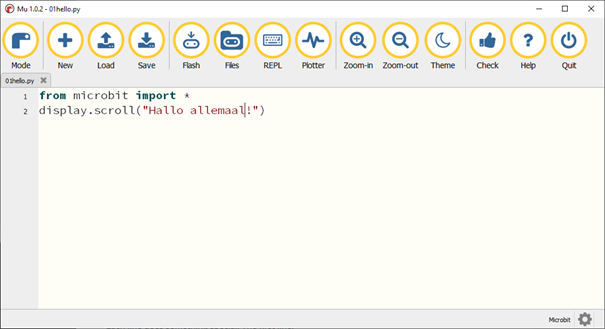 De code display is een zogenaamd object. Dit object bedient het led scherm op de Micro:bit. Je kan via allerlei methodes dit object bewerken. In dit geval met de methode scroll(). Let op de open en sluit haak achter de methode. Dit geeft aan dat het een methode is. Het is een soort functie die aan de hand van attributen (die tussen de haakjes staat) een eigen stukje code weer uitvoert. In dit geval geef je een tekst mee. Alles wat een waarde is (zoals tekst) en geen Python commando moet tussen de hoge komma’s staan. In dit geval geef je de tekst “Hallo allemaal!” mee. De functie scroll zorgt ervoor dat deze tekst vervolgens over het scherm wordt gerold.
